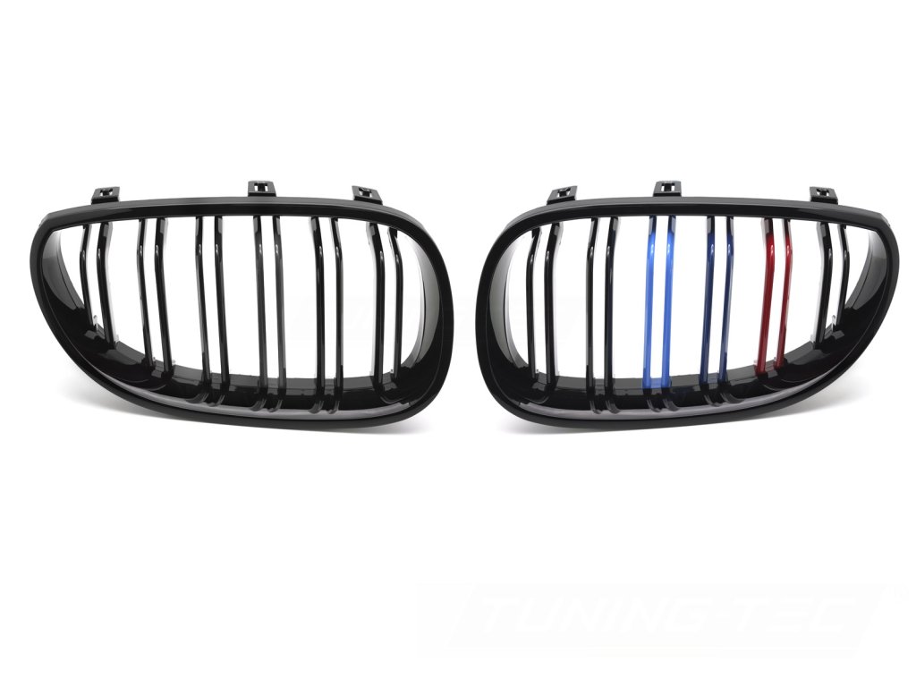 Přední maska, ledvinky BMW E60 / E61 03-10 lesklá černá, dvojitá žebra s třemi barevnými pásky