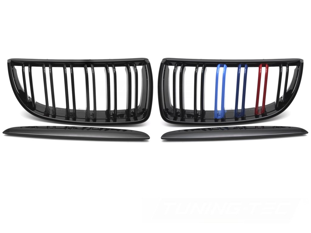 Přední maska, ledvinky BMW E90 / E91 05-08 lesklá černá, dvojitá žebra s třemi barevnými pásky