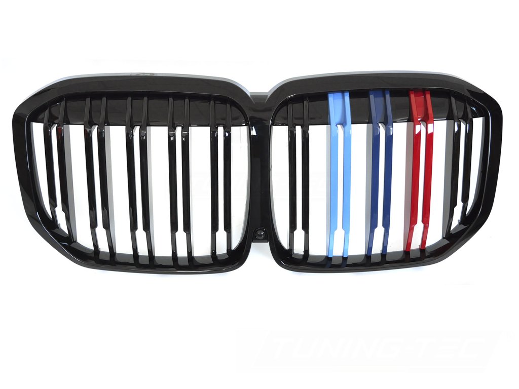 Přední maska BMW X7 G07 18-22 lesklá černá, dvojitá žebra s třemi barevnými pásky